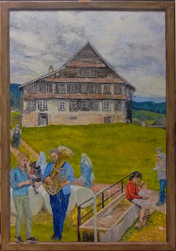 Basierend auf den kleinen Eitemperamalereien vom Apothekergärtli male ich eine Serie Tafelbilder auf Holz mit den Formaten 70cm x 100cm oder 50cm x 70cm in der Technik der mittelalterlichen Altartafeln, Ei-Öl Tempera. Das Thema ist die Welt, in der ich mich bewege, voller Gegensätze, mit denen die Menschen auf meinen Bildern zurechtkommen müssen. Die Bilder sind wie Kurzgeschichten, nur, dass nicht alle Betrachter die gleiche Geschichte sehen.